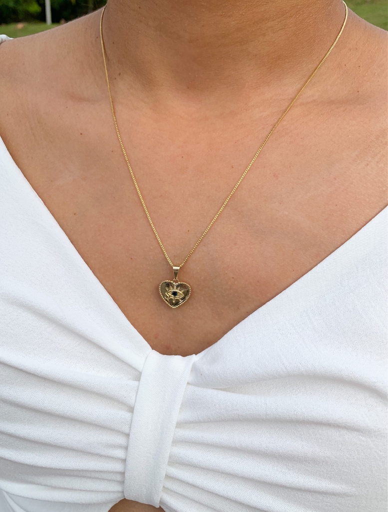 Com um aspecto inteiramente delicado e sutil esse colar é um acessório totalmente necessário em seu porta joias. Colar composto por um lindo pingente de coração com um olho grego cravejado com uma zircônia, é maravilhoso!